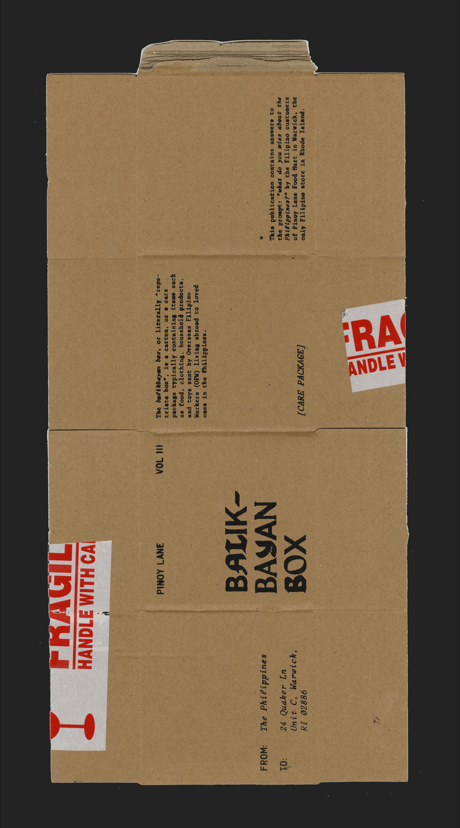 This work contains four publications, tucked in a cellophane plastic sheet bag, documenting and celebrating the only Filipino store in Rhode Island. Pinoy Lane is a glimpse and a brief exploration of what might the Filipino experience look like — within the diaspora or otherwise – through the lens of the people and artifacts of a place displaced.
